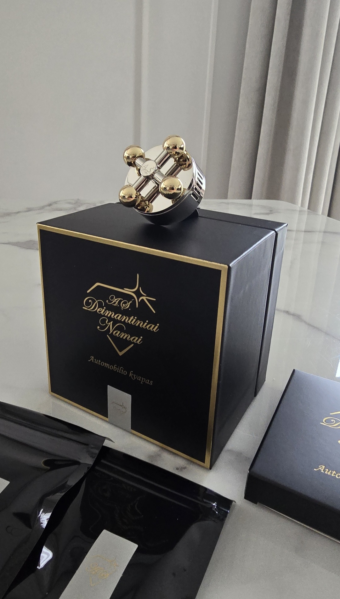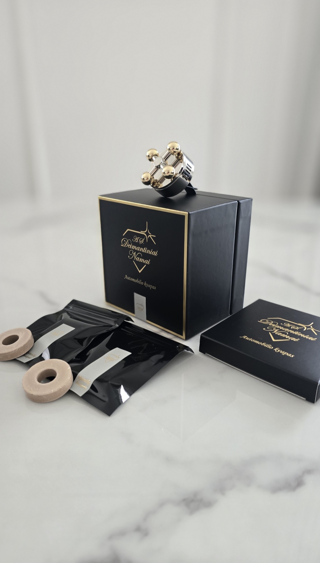 Visi komponentai supakuoti prabangioje dėžutėje su firminiu aukso logotipu, todėl puikiai tinka dovanai.