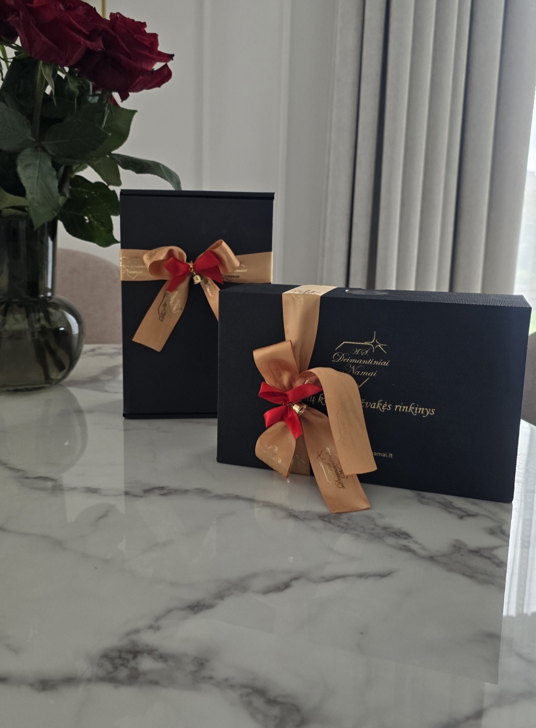Rinkinys supakuotas į elegantišką juodą dėžutę, perrištą aukso spalvos kaspinu – subtilus būdas parodyti dėmesį, meilę ir šilumą.