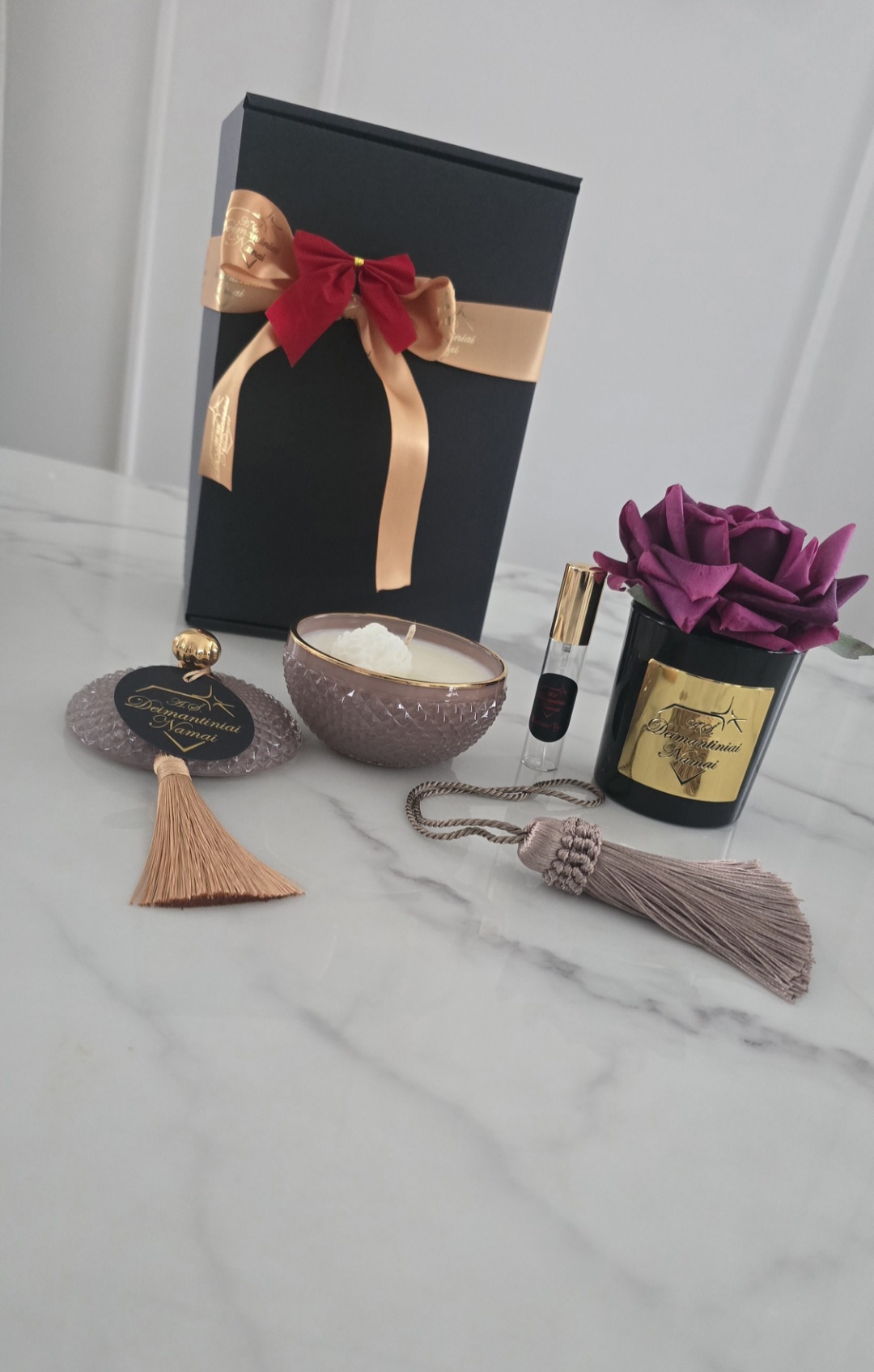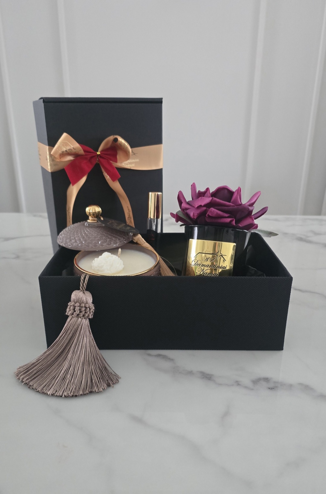 Rinkinys supakuotas į elegantišką juodą dėžutę, perrištą aukso spalvos kaspinu – subtilus būdas parodyti dėmesį, meilę ir šilumą.